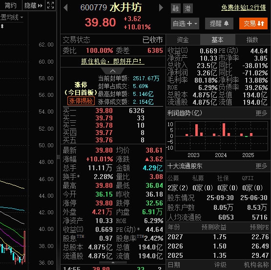 当天,市场传出“剑南春拟收购水井坊”的消息,水井坊股价涨停,封单额一度超5亿元,市值单日增长17.6亿元。