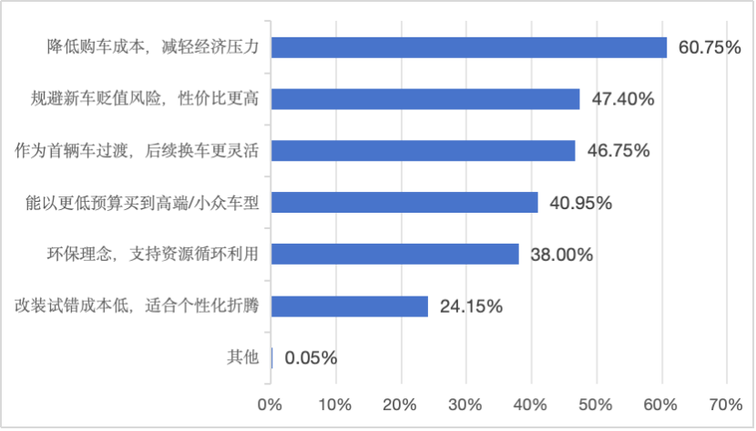 懂车帝联合中汽信科发布的《年轻用户二手车消费洞察报告》也体现出这一点:年轻人选择二手车的出发点,在“便宜”这个痛点之外,也越来越多样化了。