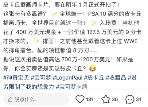 目前,保罗已与知名拍卖行Goldin达成协议,获250万美元预付款,交易过程还被Netflix影集曝光。拍卖行预估,该卡最快明年1月12日官网发售,成交价有望在700万至1200万美元(约人民币4904万元至8407万元)。保罗认为,随着宝可梦2026年迎30周年,此时出手正合适。他提醒年轻投资者,并非所有收藏品都能保值,要专注供应量极有限的物件。