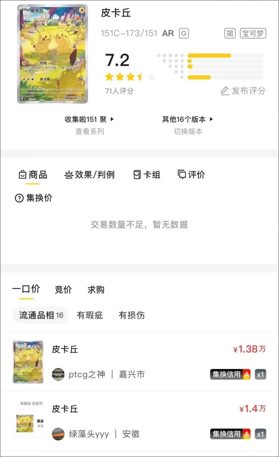 某二级交易市场平台APP显示,其中一款最稀有的皮卡丘AR卡,在平台中显示的市场价已达1.4万元/张。