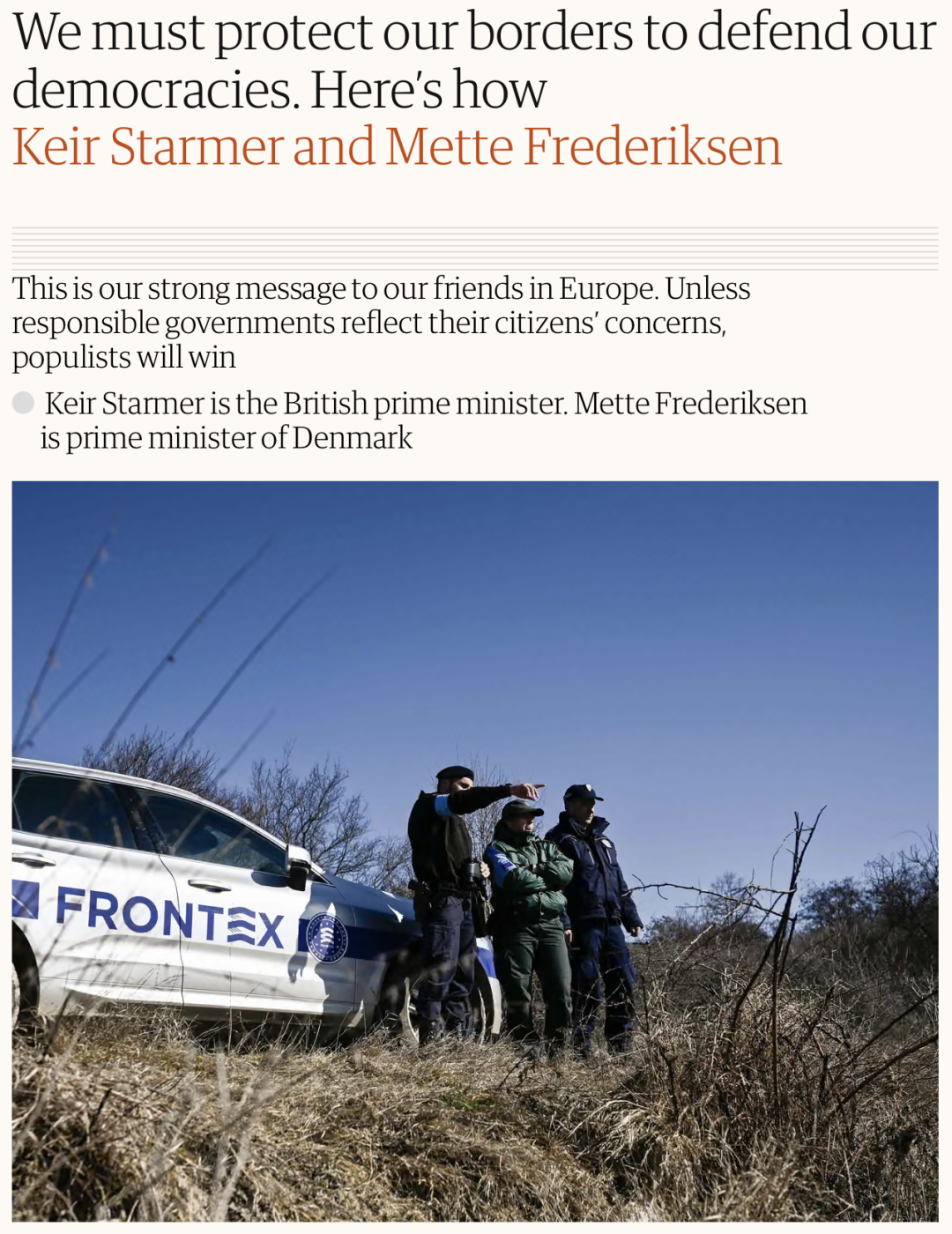 12月9日,斯塔默与丹麦首相梅特·弗雷泽里克森在英国《卫报》发表联名文章,强调保护边境的迫切性,并将其与“捍卫民主”、阻止民粹主义挂钩。文章矛头直指现行庇护制度,称之为另一个时代的产物,不适用于人口大规模流动的当今世界:“我们将始终保护逃离战争和恐惧的人们,但世界已变,庇护制度必须随之改变。”