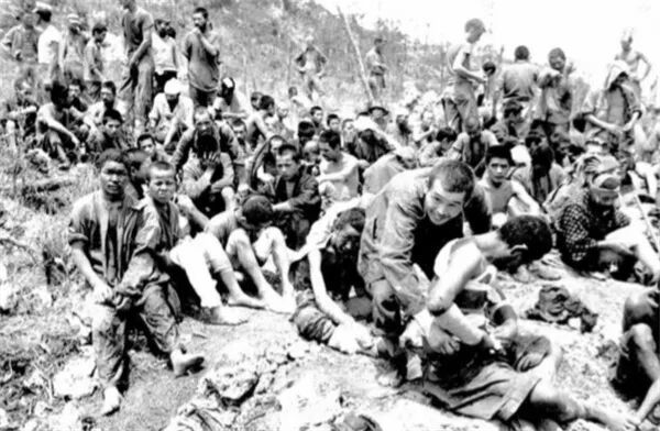 ▲ 日本投降后,冲绳岛上的难民。冲绳战役期间,大量冲绳本地居民被日军裹挟,编入战争体系,该役非正常死亡的冲绳人中,除了死于炮火和疾病、饥饿,还有很多居民死于日军强制“集体自决”。