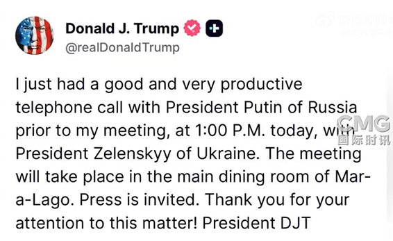 美国总统特朗普当地时间12月28日中午在社交媒体发文称,他刚刚与俄罗斯总统普京“进行了一次良好且非常富有成效的电话会谈”。按照计划,特朗普将在大约一个小时后、也就是当地时间下午1点(北京时间今天凌晨2点),与到访的乌克兰总统泽连斯基在佛罗里达州“海湖庄园”举行会晤。