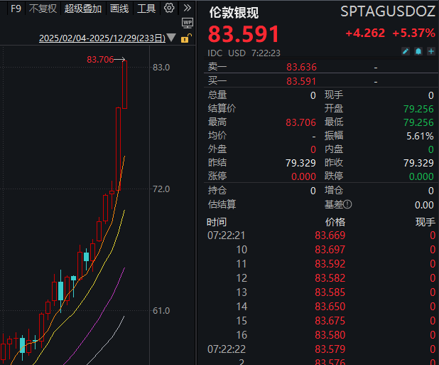 【大河财立方消息】 12月29日,现货白银开盘快速拉升,涨超5%,突破80美元关口,报83.591美元/盎司,继续刷新历史新高。