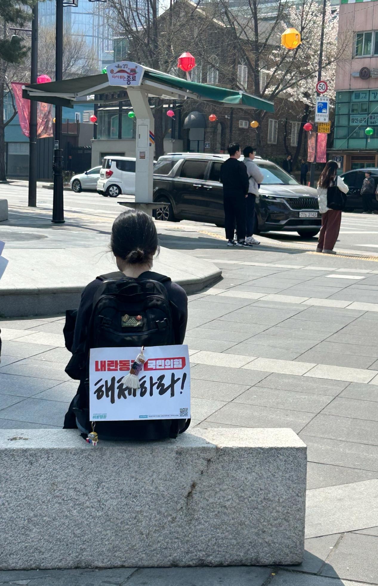 姜熙珠坐在街边石凳上,背包上贴着标语“内乱同谋的国民力量党解散吧!”