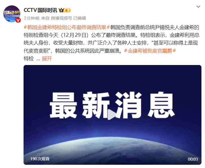据@CCTV国际时讯,韩国负责调查前总统尹锡悦夫人金建希的特别检查组今天(12月29日)公布了最终调查结果。