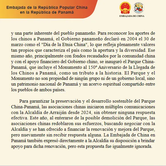 12月27日深夜,阿赖汉市政府在未作任何事前通知、也未事先与华人社团进行任何沟通的情况下,不顾现场华侨华人代表的一致反对,悍然强行拆除了位于美洲大桥观景台的、铭记华人对巴百年贡献和象征中巴人民友谊的中巴公园及华人抵巴150周年纪念碑。此举不仅粗暴践踏了巴拿马30万华侨华人同胞的集体感情,也严重伤害了中国人民对巴拿马人民的友好情谊。中国驻巴拿马大使馆对此表示极度震惊、强烈愤慨和坚决反对。