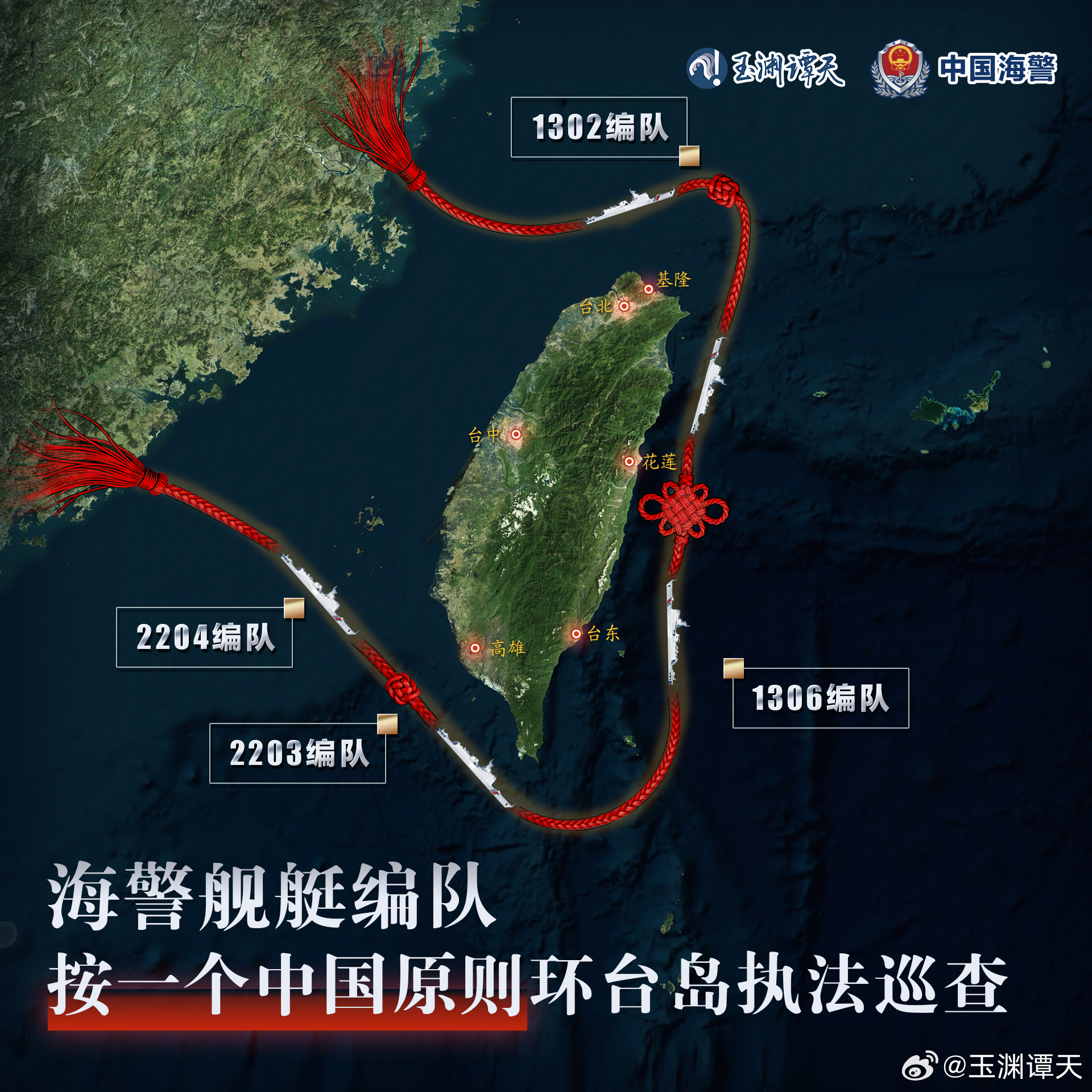 相关人士告诉谭主,中国海警此次执法巡查示意图中,示意路线整体采用缆绳造型。如何运用缆绳是海警必须掌握的船艺,缆绳勒得越紧,越稳当。同时,用来示意路线的缆绳设计为了红色,既是象征着两岸同胞血脉相连的“红绳”,也是警示“台独”分裂势力的“红线”。此外,“绳”与“省”谐音,强调了台湾就是中国的一个省。