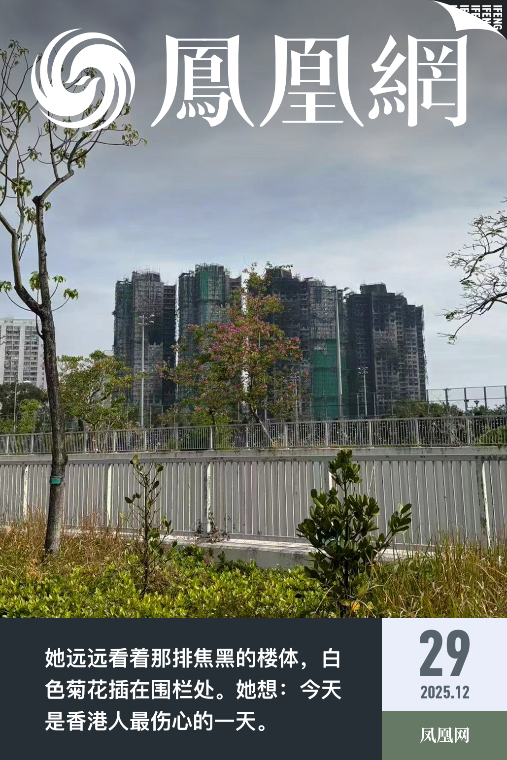 因为有朋友住在附近,火灾发生之前,罗女士就熟悉这里,知道这楼有40多年的历史。此刻,走到街心公园,罗女士看到那排建筑体已被红色警戒线封锁,与她一街之隔。她远远看着,把买来的白色菊花,插在银色围栏处。她在心里想着:今天是香港人最伤心的一天。