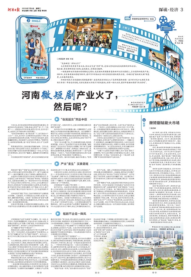 今年,河南日报采写的《河南微短剧产业火了,然后呢?》,引发业界共鸣和深思:流量数据很重要,但微短剧总得留下点什么。于是更多人在埋头赶路之余,也开始抬头眺望远方。