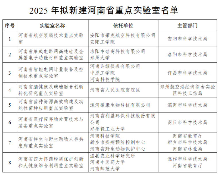 【大河财立方消息】 12月30日,河南省科技厅公示拟新建省重点实验室名单,共有8家实验室入选,包括河南省航空浆扇技术重点实验室、河南省集成电路用高纯硅及金属基电子功能材料重点实验室、河南省智能电网计量装备及控制技术重点实验室等。