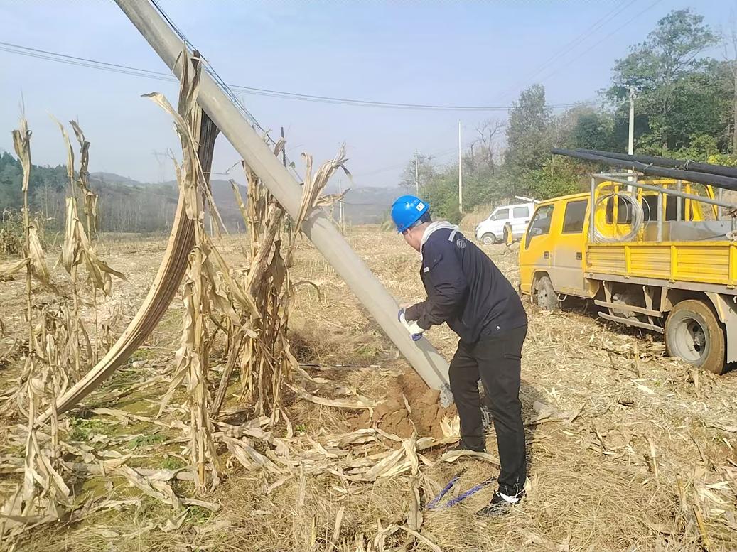 隐患点找到了,抢修刻不容缓。初冬的山风带着寒意,但突击队员的工作热情却丝毫不减。他们迅速勘察现场,评估安全隐患,制定周密的移改方案。既要快速恢复线路安全、确保通信畅通,又要尽可能减少对耕地及周边环境的影响。 立杆、紧线、固定、抬升……一系列操作专业而迅捷。杆路被重新扶正加固,垂落的光缆被规范提升至安全高度,潜在 的风险被彻底排除。整个过程高效有序,于当日中午12时前全部处理完毕。
