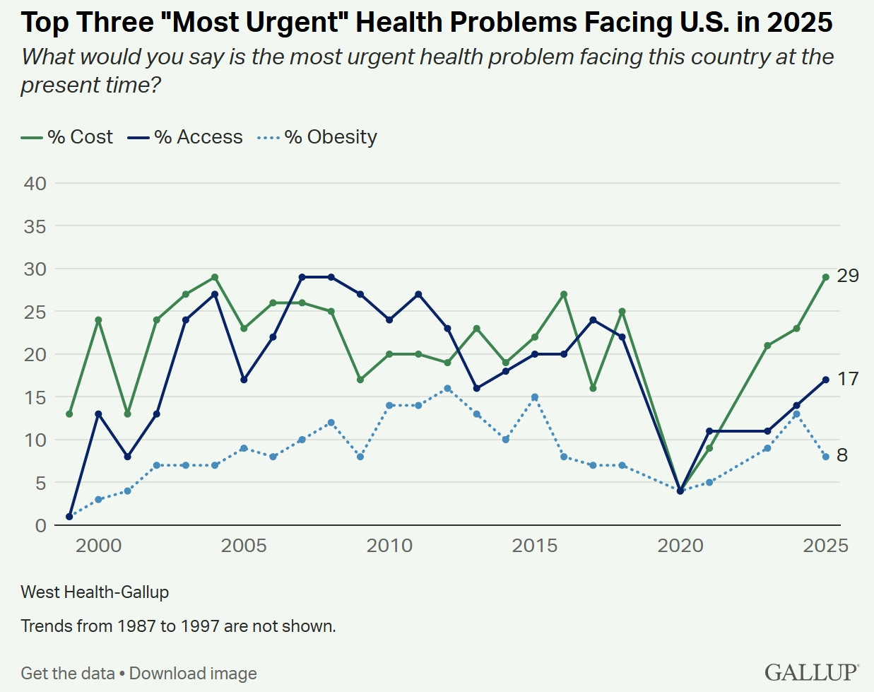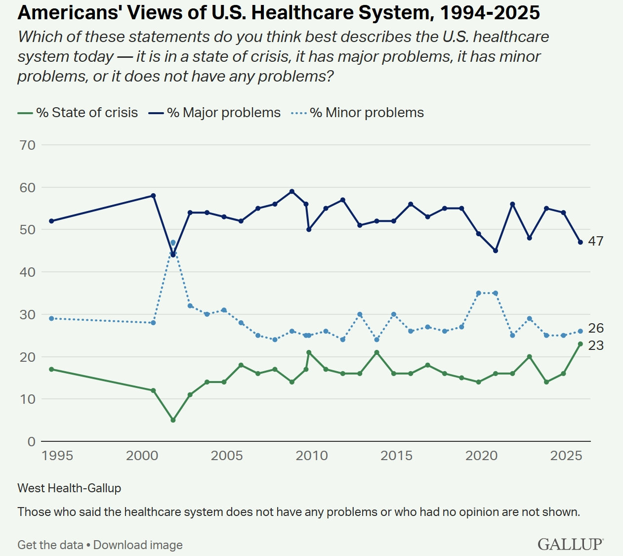 认为美国医疗体系“处于危机状态”的受访者比例高达23%,是自1994年来调查结果中的最高值。