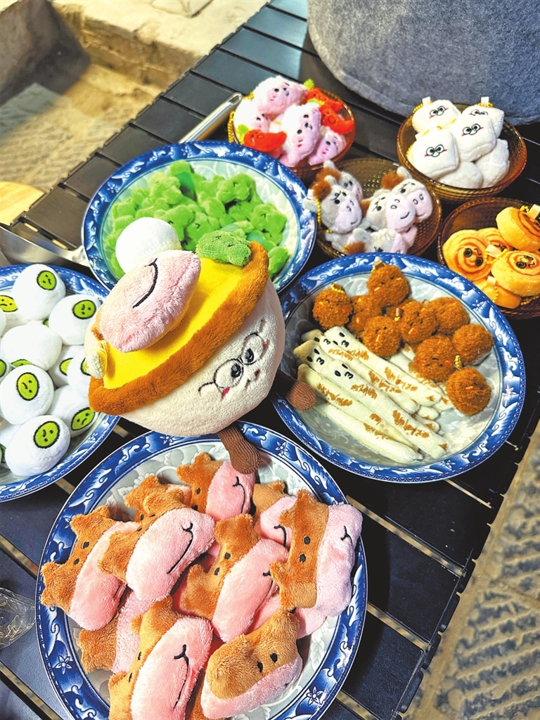 欢声笑语中,店主王泽茗从毛茸茸的“锅”里端出了一碗毛茸茸的“牛肉汤”。这碗“汤”是一款毛绒玩具。