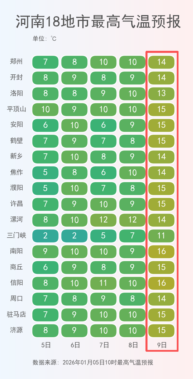 大家可以记一下这个节奏:周五,郑州最高气温预计攀升到14℃。周六,会有一个短暂的下探,降到9℃。但到了周日,气温会一口气冲到16℃。