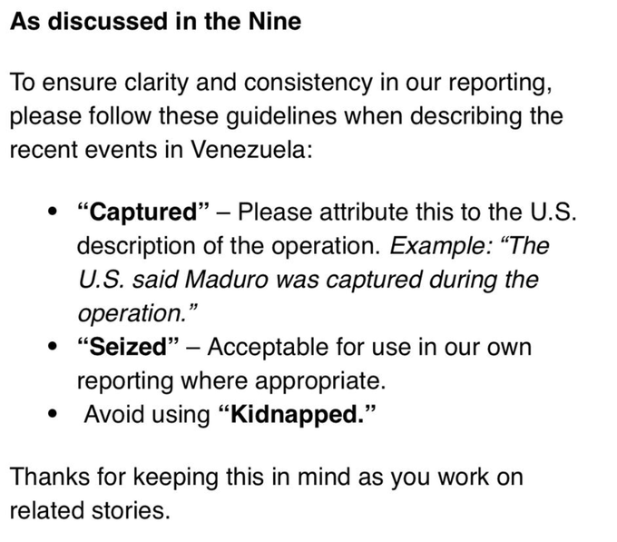 他随文公布的一则指令写道,“为确保我们报道的清晰度和一致性,请在描述委内瑞拉近期事件时遵循以下准则:‘捕获’(Captured)——请注明这是美方对该行动的描述。例如:‘美方称马杜罗在行动中被捕获。’‘扣押’(Seized)——在适当的情况下,可用于我们自己的报道中。避免使用‘绑架’(Kidnapped)一词。”