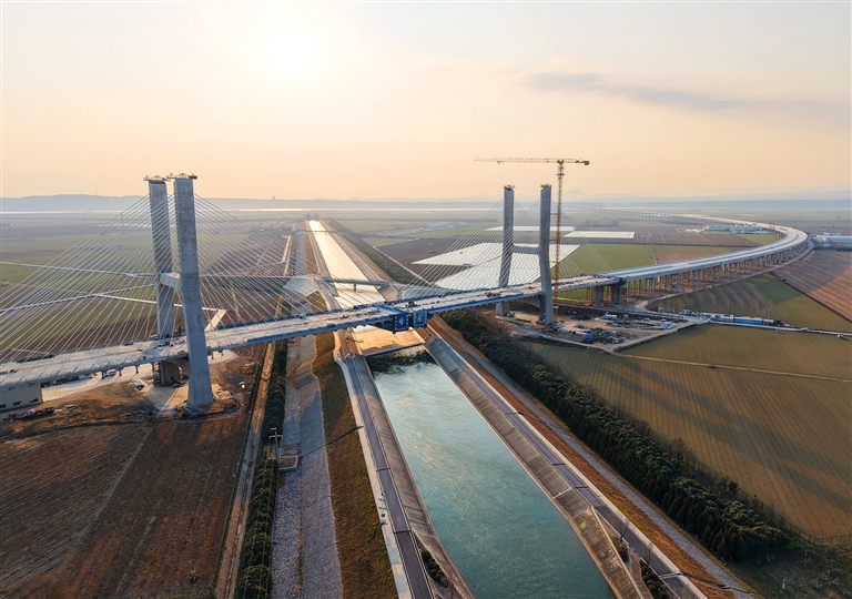 1月6日,焦平高速焦荥段南水北调斜拉桥项目正在加紧施工,该斜拉桥长482米,主跨跨径252米,主塔最大高度100米。徐宏星 摄