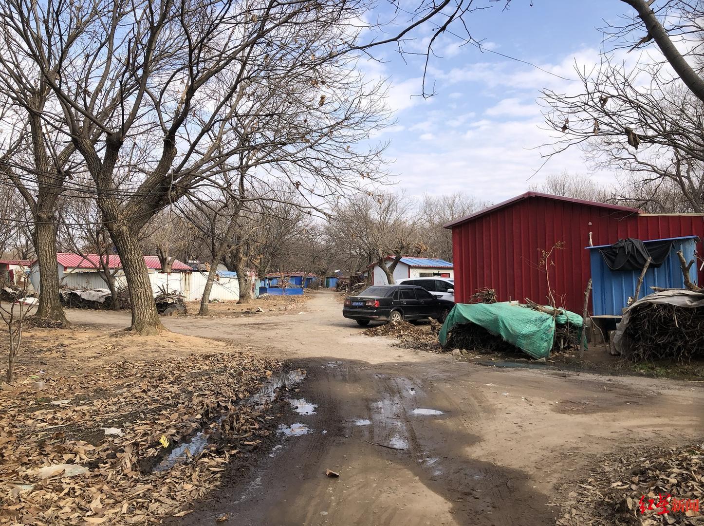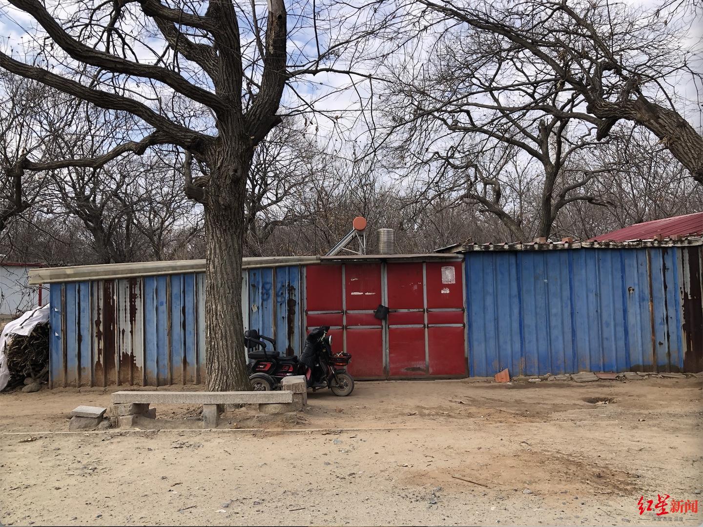 这些房子大多用蓝、红色铁皮搭建,内部配以玻璃或塑料材料。为了保暖,铁皮内还有泡沫夹层。许多村民搭了四合院,一家三代同住,一些板栗树长在院内。