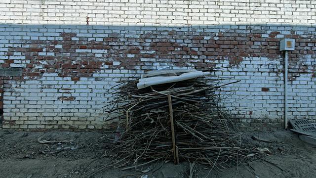 老人将捡来的柴火堆放在门外