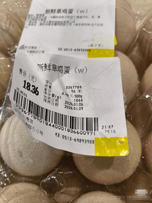 近日,有网友爆料称,自己于1月7日在江苏南通大润发任港店购买了一款新鲜草鸡蛋,花费18元。该鸡蛋外包装标注的保质期为1月6日至9日,但撕开标签后,其下层残留的旧标签显示,原保质期应为1月2日至5日。对此,该网友提出质疑,认为涉事门店通过更换标签的方式,变相延长商品售卖时间。