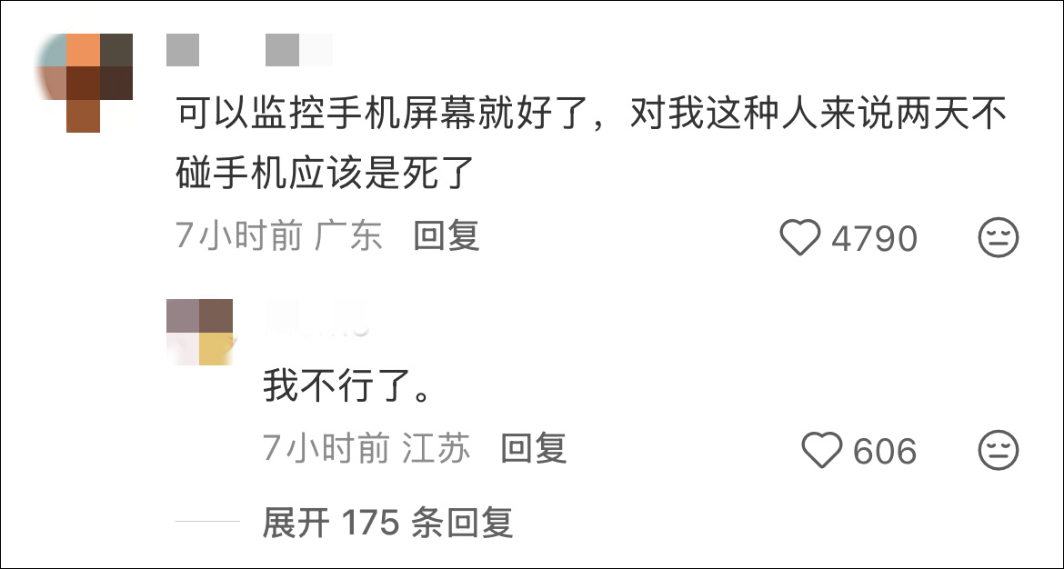 一位网友说:“可以监控手机屏幕就好了,对我这种人来说两天不碰手机应该是死了。”