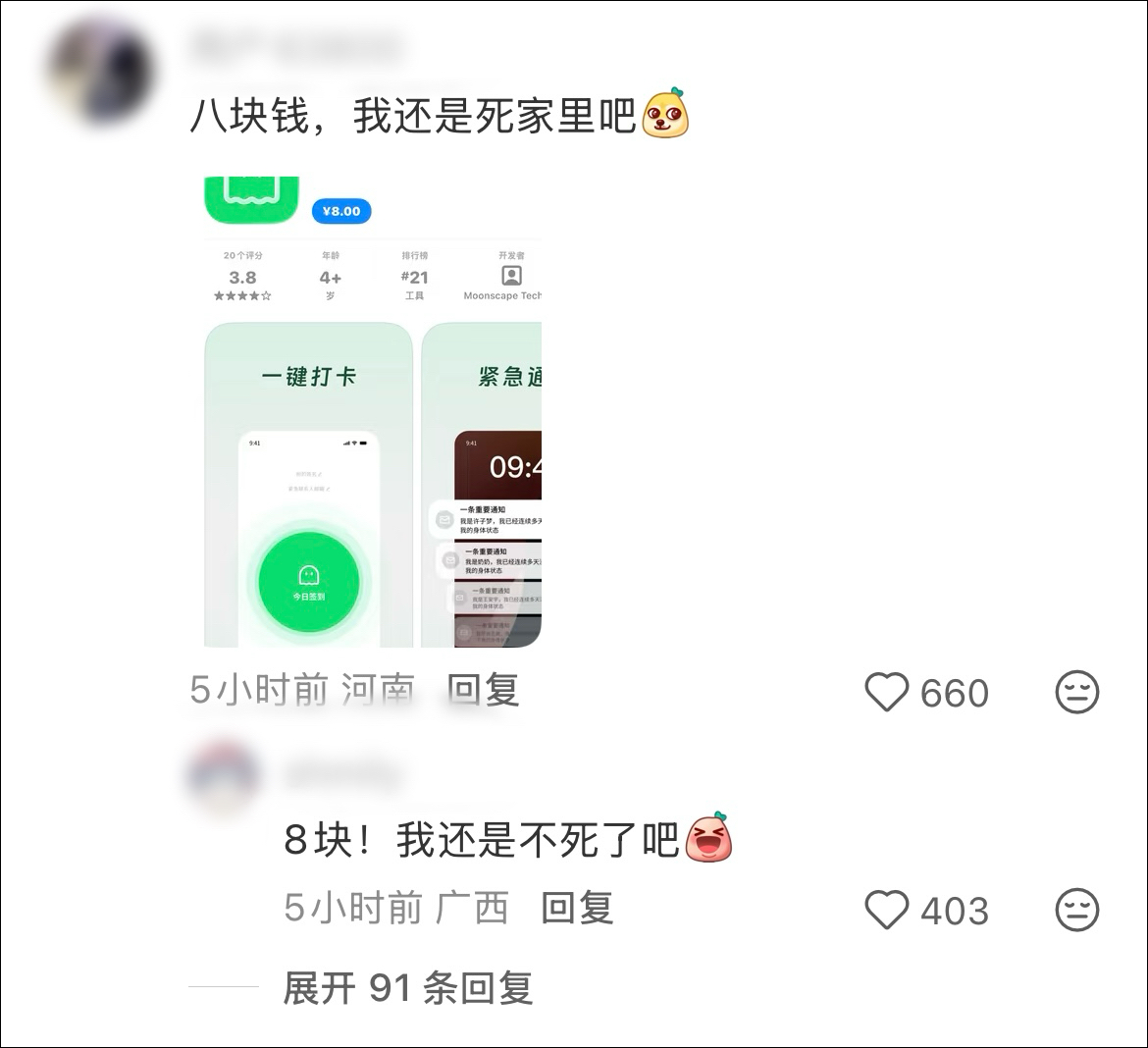 有网友担心,每天都要打卡,偶尔忘记了,系统会不会告诉我的紧急联系人:“机主挂了,随机吓死我朋友。”