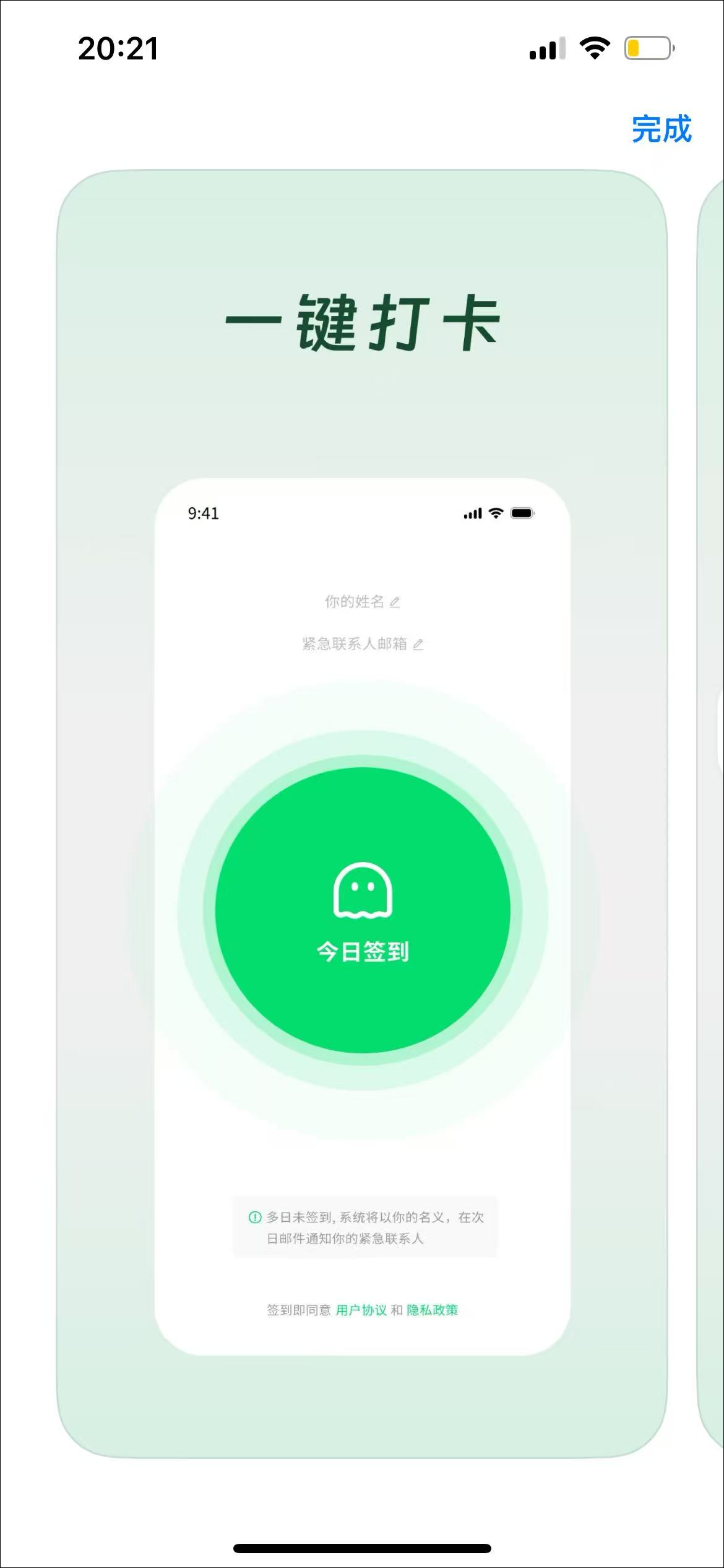 正如其名,这款App的功能非常简单。根据App Store下载页的功能介绍,这是一款为独居人群打造的轻量化安全工具。软件不需注册登录,首次使用只需填写联系人姓名与邮箱即可。每天打开应用轻轻一点完成签到,后台自动监测状态。