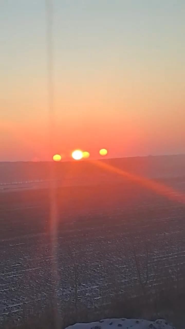 视频画面显示,遥望远方,绚烂夺目的太阳刚刚冒出地平线,但令人意外的是,太阳的左侧和右侧,分别出现三个“小太阳”,就像一个大太阳带着三个小太阳出行。有网友调侃称,快请后羿前来。
