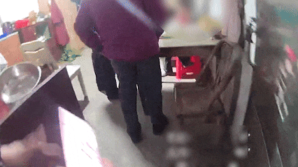 屋内物品散落一地,一位老人手足无措地站在一旁,家中还有一个七八岁的女孩,懵懂又沮丧地看着一切。
