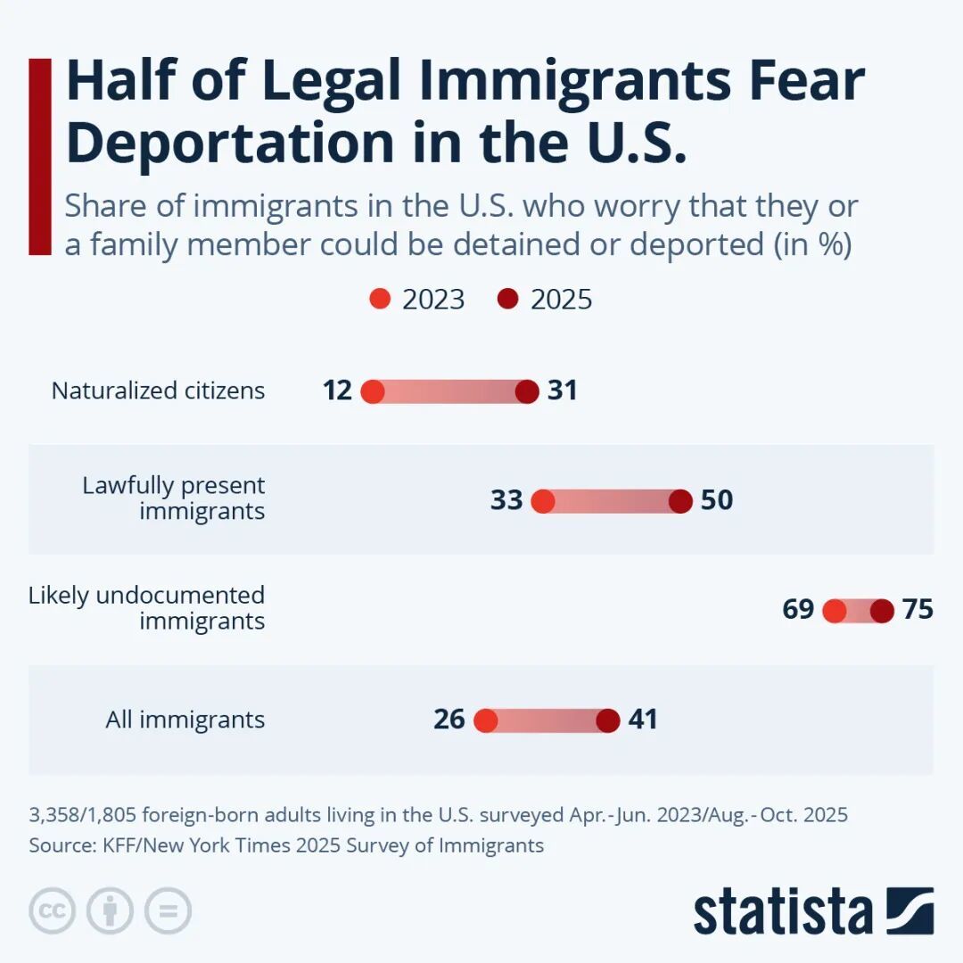 ◆2023年至2025年,美国各类移民担心被遣返的人数占比显著增加。图源:Statista