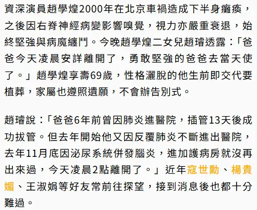 2025年11月,赵学煌因泌尿系统并发脑炎病入院,在ICU抢救后一直没有出来,最终病情加重至1月10日去世,女儿证实父亲离世时状态平静,强调其一生豁达洒脱。家属尊重其植物葬礼遗愿,骨灰将回归自然,且不举办追思会。