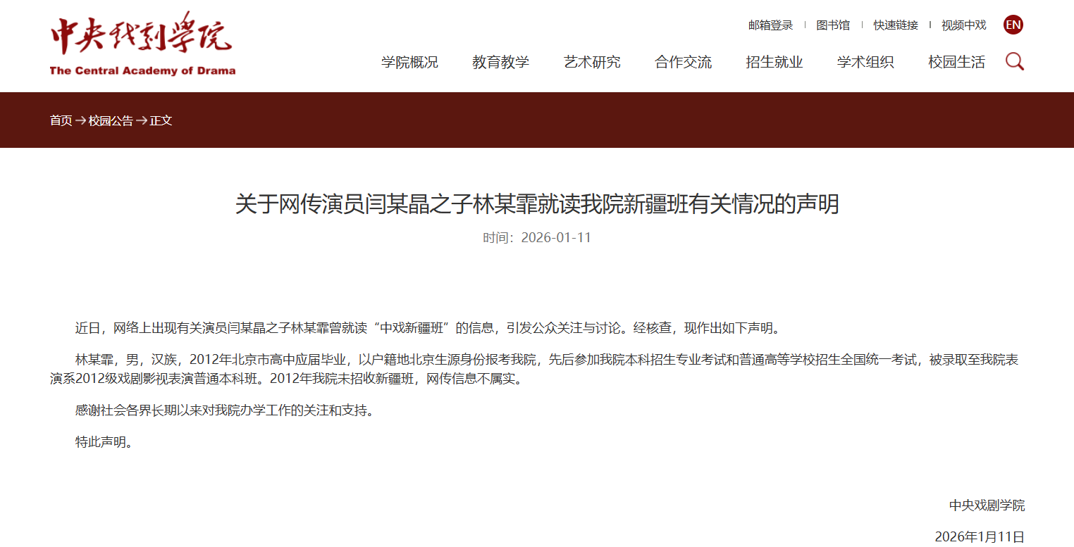 据此前报道,闫学晶儿子林傲霏陷入中戏入学资格合规性风波。1月11日晚,中央戏剧学院对此发布声明辟谣:“林某霏,男,汉族,2012年北京市高中应届毕业,以户籍地北京生源身份报考我院,先后参加我院本科招生专业考试和普通高等学校招生全国统一考试,被录取至我院表演系2012级戏剧影视表演普通本科班。2012年我院未招收新疆班,网传信息不属实。”