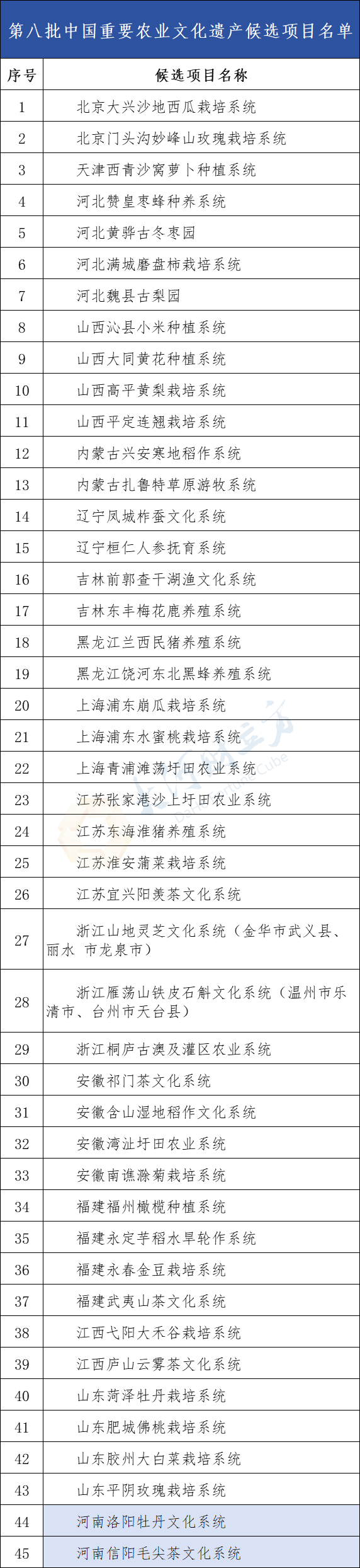 名单显示,河南洛阳牡丹文化系统、河南信阳毛尖茶文化系统在列。