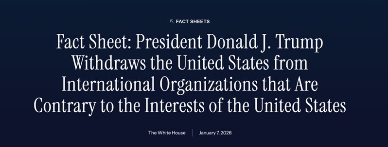 2025年2月4日,特朗普签署第 14199 号行政令,要求国务卿联合美国常驻联合国代表,对美国参与且提供资金支持的国际组织、以及美方缔约的各类公约条约进行全面审查,筛选出那些与国家利益相冲突的项目,并要求国务卿提交审查报告,随后这场筹备已久的行动最终在2026年1月7日正式落地。