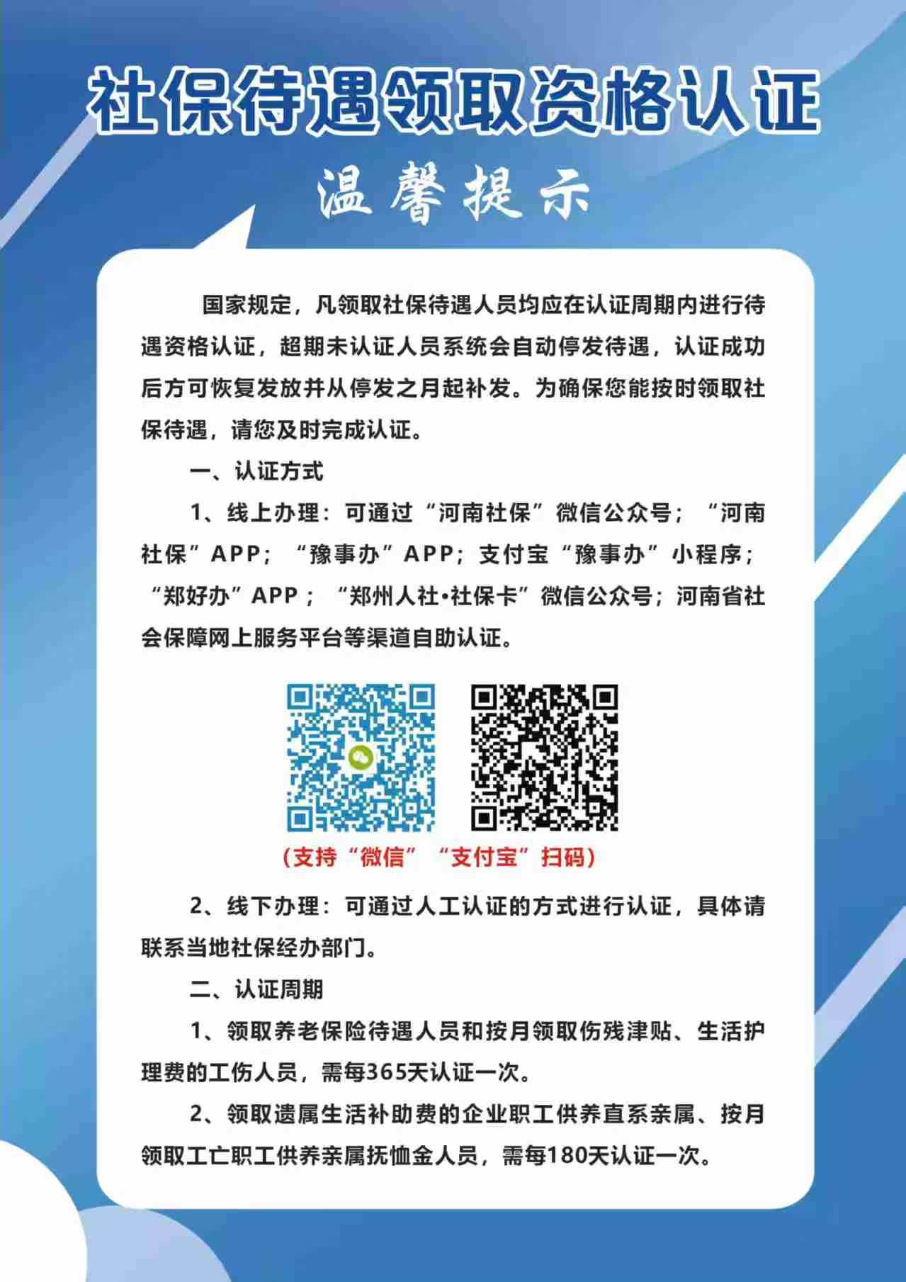 1月14日,大河报·豫视频记者从郑州市人社局了解到,凡领取社保待遇人员均应在认证周期内进行待遇资格认证,超期未认证人员系统会自动停发待遇,认证成功后方可恢复发放并从停发之月起补发。为确保您能按时领取社保待遇,请您及时完成认证。