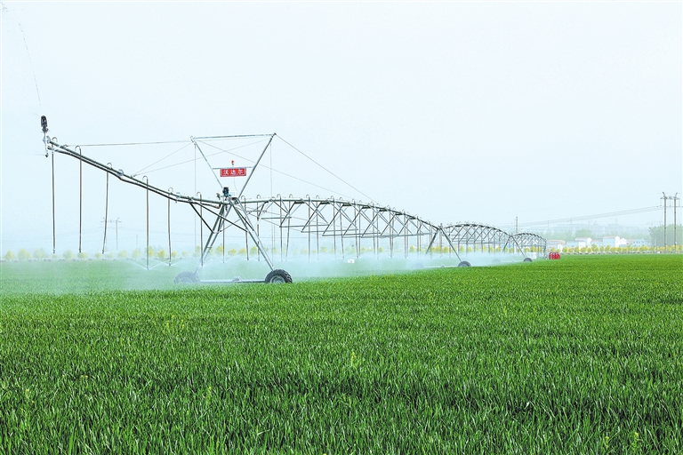 从靠天吃饭到知天而作,智慧农业正重塑农业生产方式。王雷介绍,在他流转的一块高标准农田里,安装了臂展260米的指针式自动喷灌机,打开开关便能行走灌溉,覆盖面积达300多亩。另外,政府还配备了11台卷盘式喷灌机,让他种田灌溉无忧。