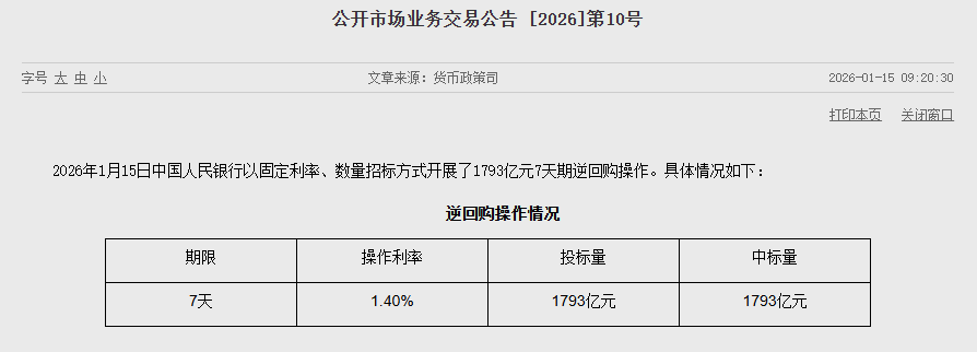 【大河财立方消息】1月15日,央行公告称,开展1793亿元7天期逆回购操作,中标利率为1.40%,与前值持平。