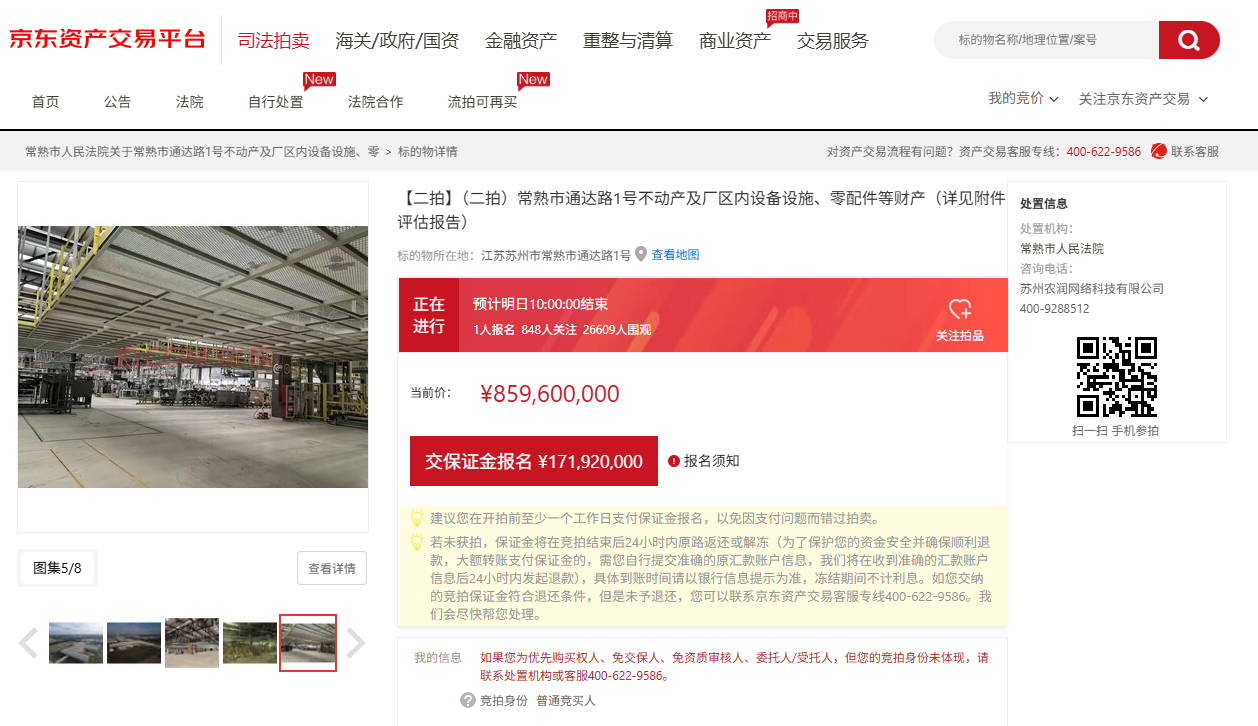 【大河财立方消息】 1月15日上午10点,京东资产交易平台披露的信息显示,常熟市通达路1号不动产及厂区内设备设施、零配件等财产二次拍卖启动。