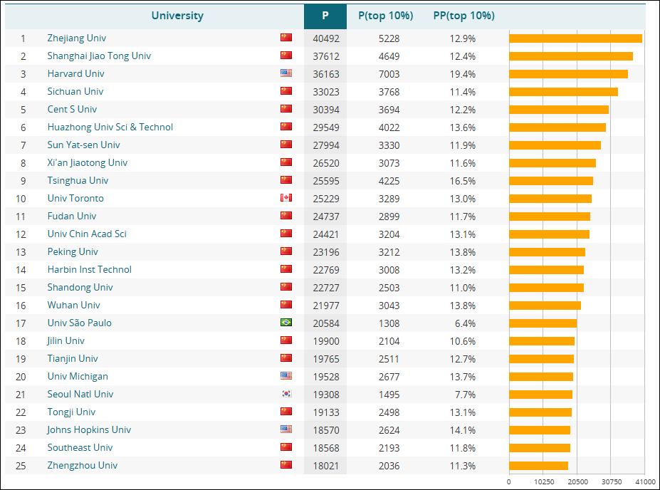值得一提的是,CWTS还开始发布一项基于另一学术数据库“OpenAlex”的替代排名。在该排名中,哈佛大学位居第一,但趋势仍是相同的:其后13所学校中有12所是中国高校。