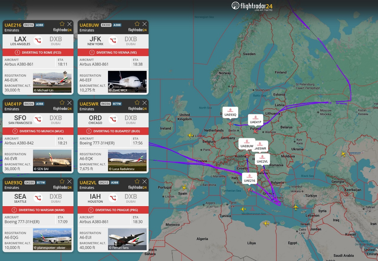 而且需要注意的是,受影响的不仅仅是抵离中东的航线,一些途径欧亚的航线也受到影响不得不折返返航,这是因为起飞前制定的飞行计划与油量并没有考虑到绕飞中东这一因素。而由于战争爆发过于突然,大量以中东为目的地的飞机飞到一半才接到战争爆发的通知,随后立即折返或者就近备降。其中阿联酋航空机队主要为空客A380与与波音777这种大型机,对于降落机场跑道要求极高,因此能选择的备降机场基本也就那几个枢纽机场。
