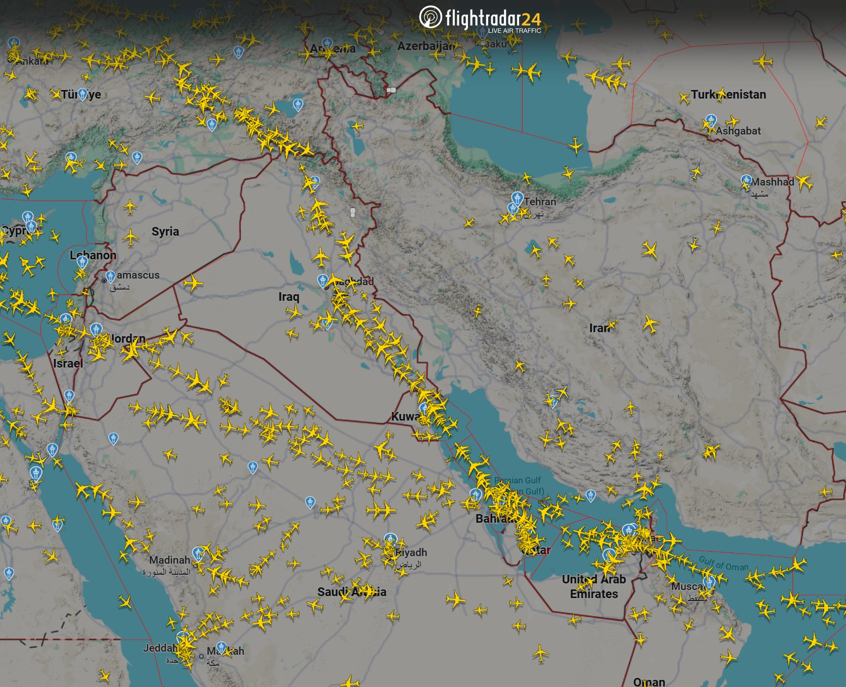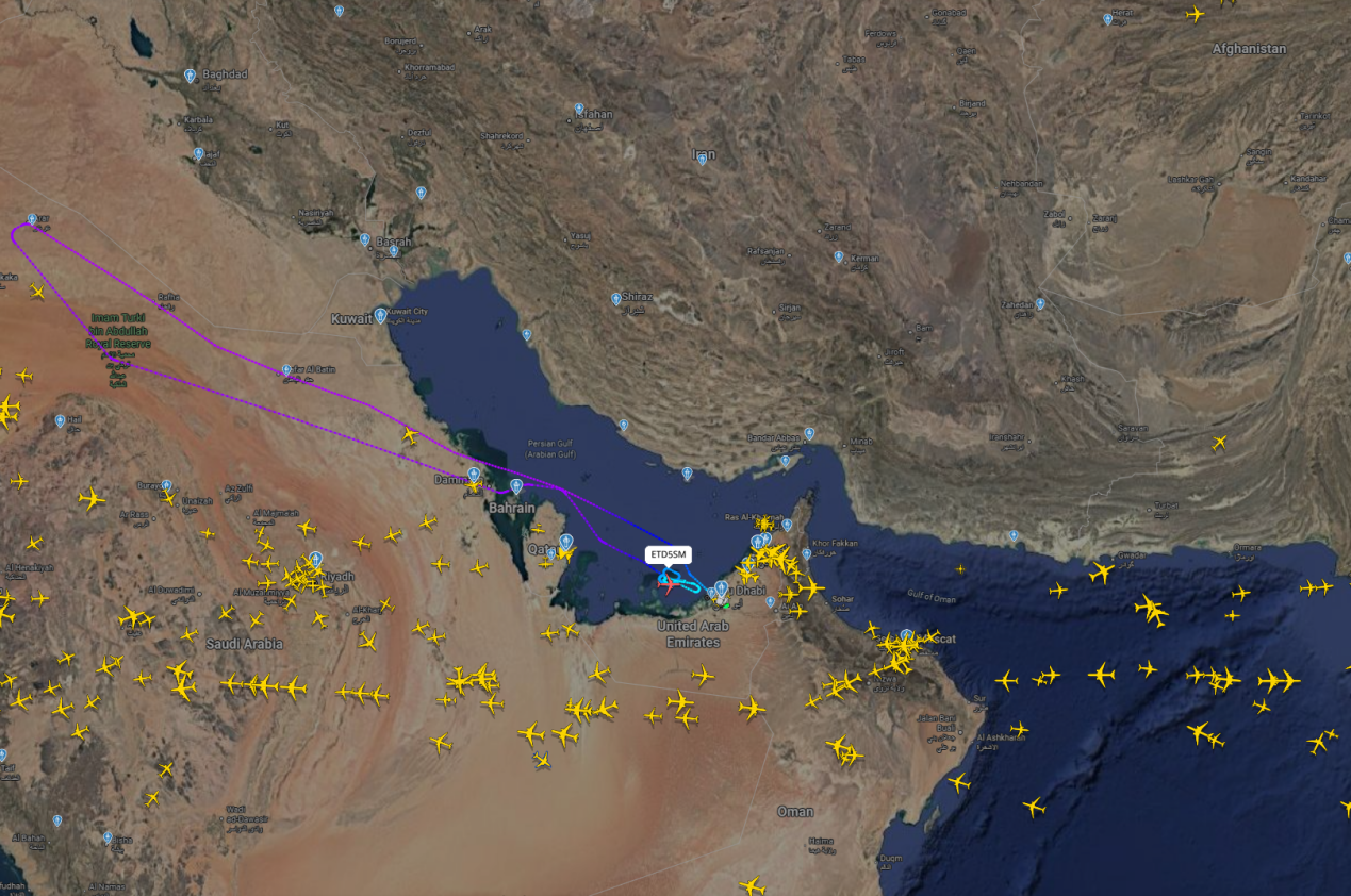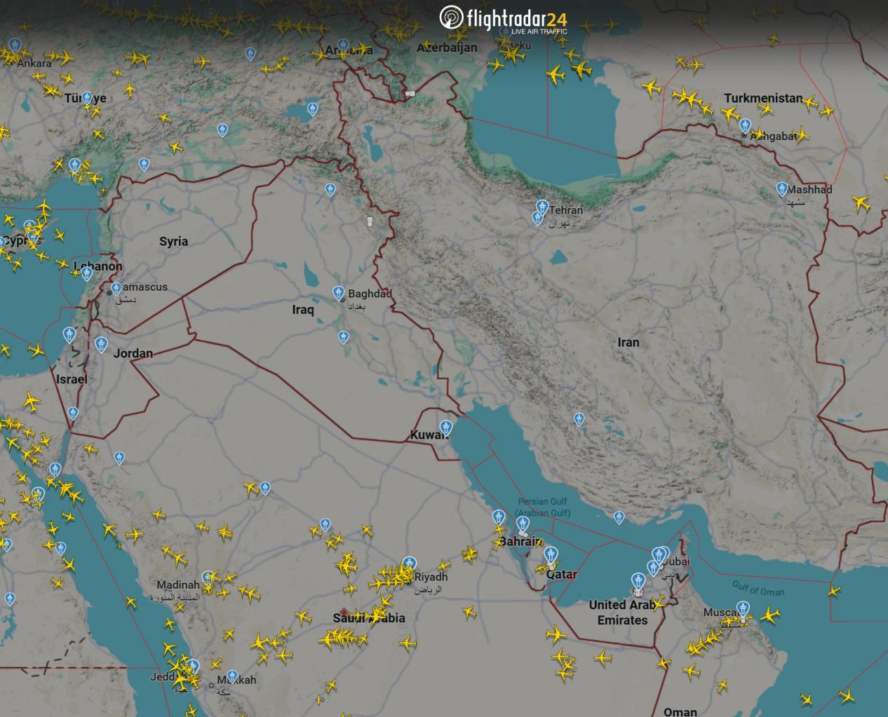 当炸弹在德黑兰落地时,中东空域有数百架飞机飞行。