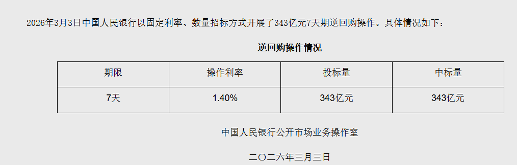 【大河财立方消息】3月3日,央行开展343亿元7天逆回购操作,投标量343亿元,中标量343亿元,操作利率为1.40%。数据显示,今日有5260亿元逆回购到期。