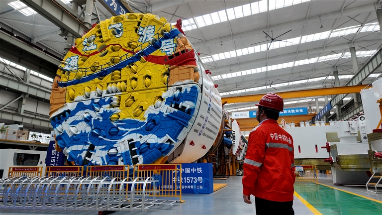 中铁装备集团副总工程师、技术中心主任贺飞正在查看即将发往吉林省中西部供水一期工程的盾构机。河南日报全媒体记者 陈浩 摄