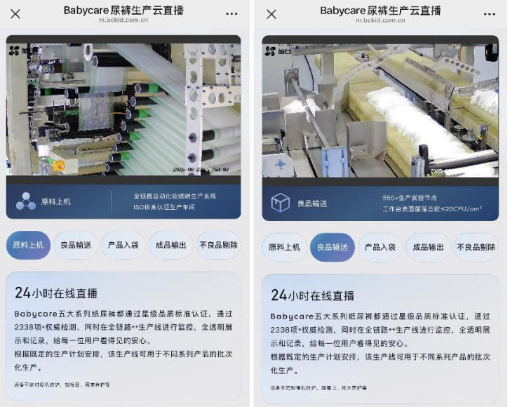 Babycare在品质建设上行为可谓是环环相扣。自2021年启动“透明公示计划”以来,品牌逐步构建了从产品检测报告查询、防伪溯源双码系统,到如今24小时生产线直播与“千人质检员”计划。消费者不仅可以通过外包装溯源码了解产品的完整信息,还能实时观看从原料到成品的整个生产过程,甚至有机会走进工厂实地参与质量监督,从多个层次实现信息透明化。