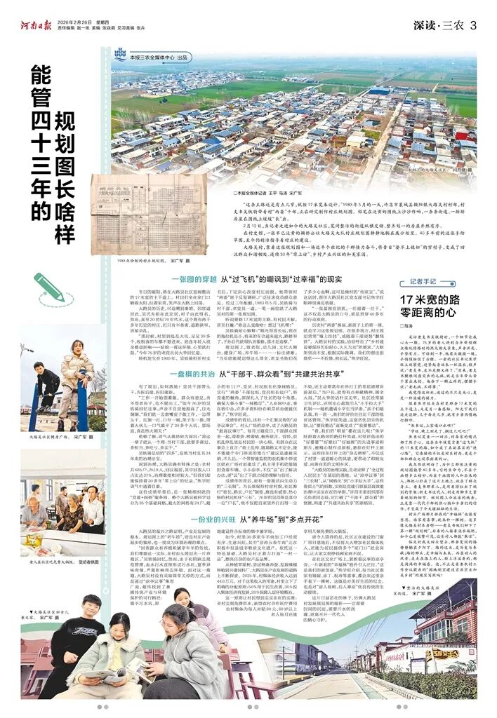 规划图上,敬老院、幼儿园、文化大舞台、健身广场、养牛场……一一标注清晰。“当年就能规划得这么周全,老支书他们花了多少心血啊,这可是俺村的‘传家宝’。”说这话时,现任大路吴社区党支部书记焦学旺眼神里满是敬重。