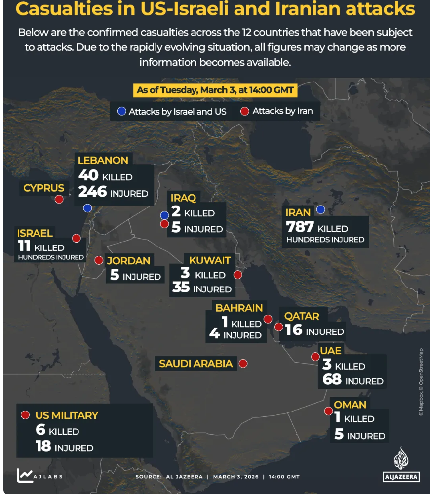 半岛电视台数据显示,截至3月3日晚,冲突外溢已导致以色列、黎巴嫩、科威特、阿联酋等地区国家数百人伤亡。