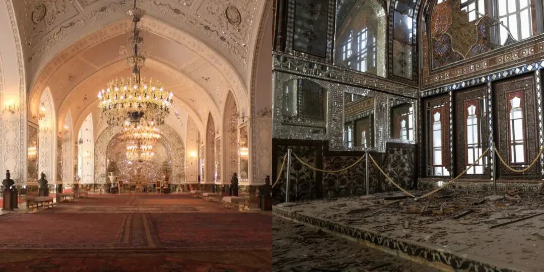 披露出的视频显示,原本富丽堂皇、以精美琉璃瓷砖和雕花穹顶闻名的玫瑰宫,如今已震碎大半,到处布满碎石和烟尘。炮火让那些描绘波斯文明盛景的图案,变得斑驳模糊。