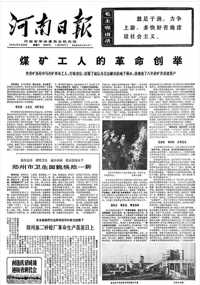 1970年8月22日,《河南日报》头版刊发《煤矿工人的革命创举》。