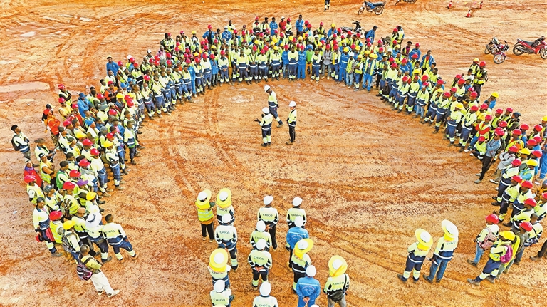 河南国际几内亚港口的建设,带动了当地人就业,仅港口运营就有300个工作岗位,大大提升了当地的就业,改善了民生。图为2025年4月24日,项目施工前的安全例会。 王栋元 摄