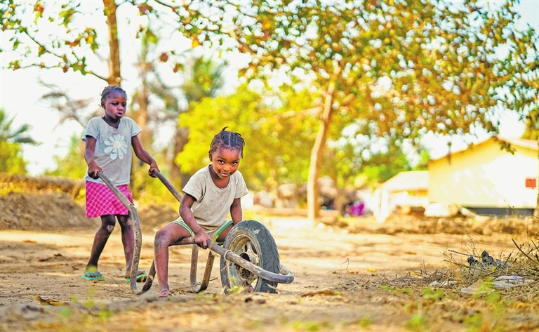 2026年1月18日,几内亚博凯地区,小朋友在当地新建的房子前玩耍,中国企业的到来改善了当地人们的生活。 河南日报全媒体记者 王亚鸽 崔超 摄